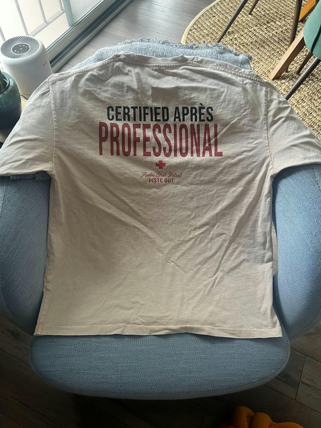 The Certified Après Professional tee is for those who take their post-ski responsibilities seriously. When the lifts stop spinning and the bar lights come on, this is your uniform. Clean on the front, authoritative on the back, and built to feel like an earned credential, not just another graphic tee.